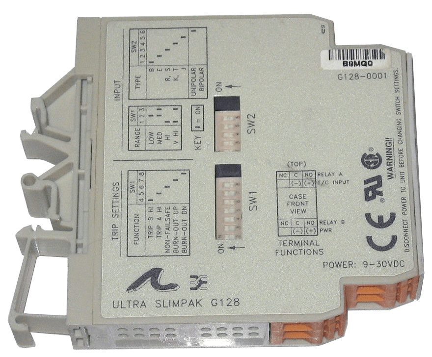 Brand: EurothermThe Ultra Slim Pak G128 is a DIN rail mount, thermocouple input limit alarm with input terminal cold junction compensation (cjc), dual setpoints and two contact closure outputs. The field configurable input and alarm functions offer flexible setpoint capability. There are up to six temperature ranges available for each thermocouple type to ensure accuracy and maximize setpoint resolution.