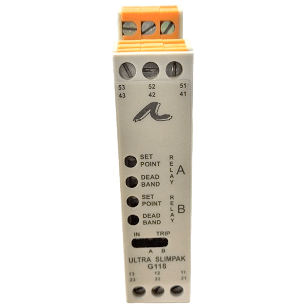 Brand: EurothermThe Ultra SlimPak G118 is a DIN rail mount, RTD input limit alarm with dual setpoints and two contact closure outputs. The field configurable input and alarm functions offer flexible setpoint capability. There are up to eight temperature ranges available for each RTD type to ensure accuracy and maximize setpoint resolution.