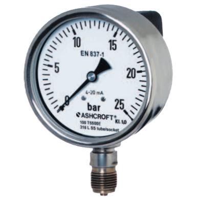Brand: Ashcroft Inc.The Ashcroft® T5500E process gauge with output combines a pressure gauge and pressure transmitter; reducing costs for multiple instruments. This model can be integrated into safety and data acquisition systems or hazardous applications.