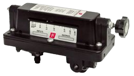 The Rotork Fairchild Model 21 Adjustable Ratio Pneumatic Relay has a signal chamber lever arm, whereby the ratio of output pressure to signal pressure is infinitely adjustable. The adjustment range permits signal amplification of 1:30 or signal reduction of 30:1 by rotation of the ratio adjustment knob which moves the fulcrum. Output pressure is a function of signal pressure times the ratio of lever arm lengths on either side of the fulcrum. Bias may be introduced by means of the set screws.